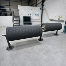 A singular industrial roller after laser surface preparation, rubber build, vulcanisation & finishing.